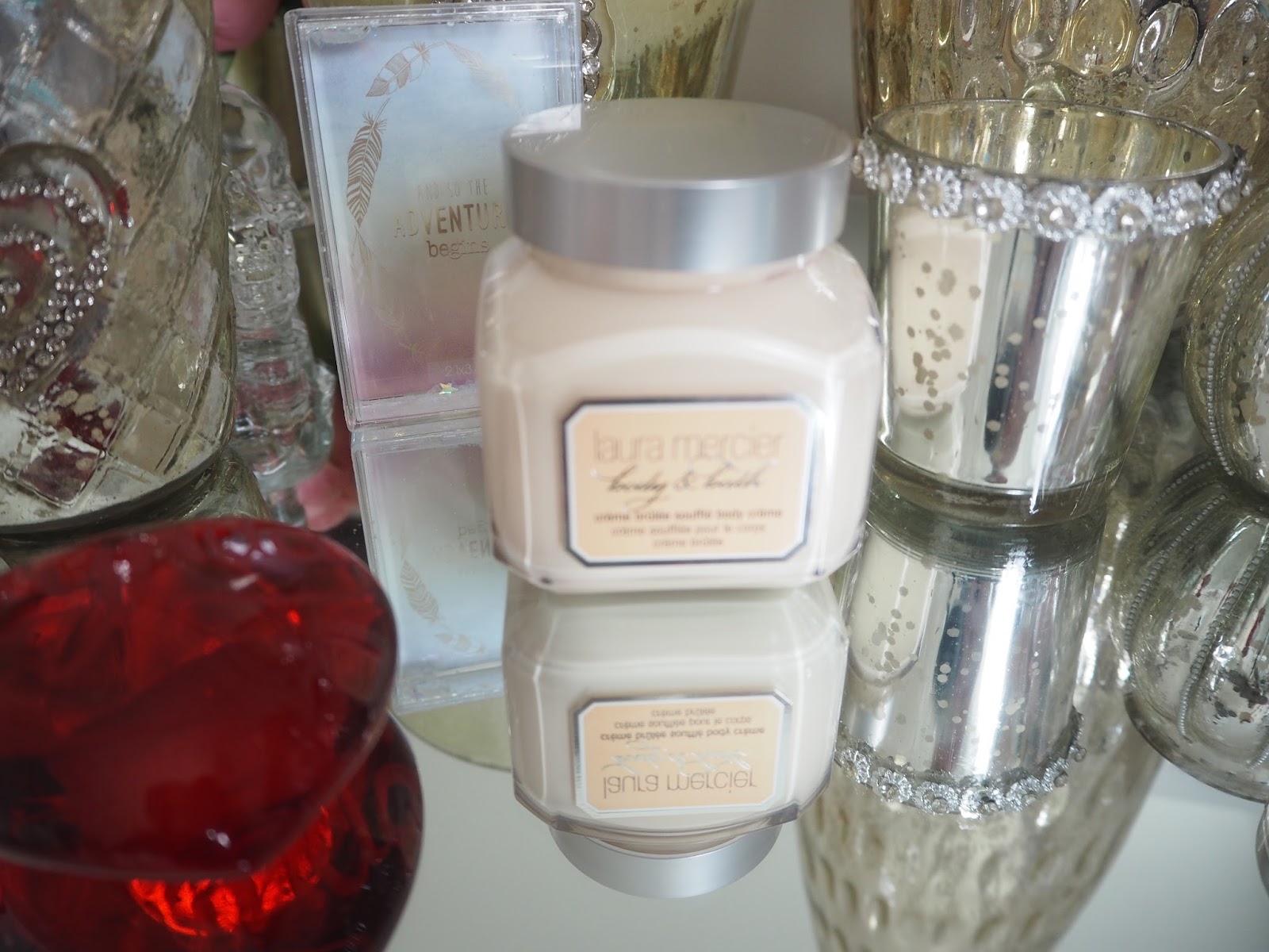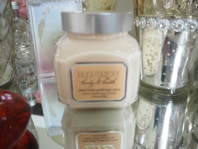 Laura Mercier Creme Brulee Souffle Body Creme this jar is pure heaven, everything about it screams luxury, from the weight of the jar to the fragrance and on to the product itself. The fragrance speaks for itself as it really does smell like a creme brulee with a soft caramel undertone, you would expect it to be a bit sickly sweet and in fact it isn't at all overpowering, the formula literally melts into your shim leaving it incredibly soft and moisturised with no tackiness. The thing I find with quality body care is that a little really does go a long way, you don't need to soak yourself in product to get the benefit.