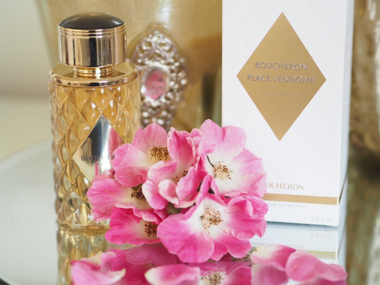 Pink Pepper, Orange Blossom and Rose are the first impressions of this fragrance followed by Jasmine and honey with a base note of cedar wood, it really is quite a contradiction in my opinion, I want to say light and floral but it has a beautiful warmth that I imagine comes from the Honey, it is not in the slightest cloying or heavy but the smallest spritz really does provide lasting power that you wouldn't need to top up all day unless you wanted to. The heavy weight glass bottle with it's raised quilted diamond effect said to reflect the paving stones of Place Vendome is topped with a smokey gem housed in gold. This is not a bottle you will want to hide away, but as always with fragrance NO sunlight please.